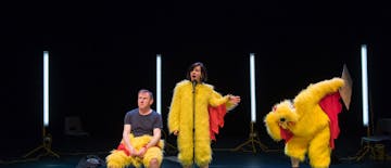 The three chickens on stage are like three headless Slovenias who cannot find a common language. They are trying. They are trying very hard. They are trying to the fullest and beyond, but they don’t succeed. They don’t know it yet, but this is a show made for Slovenia. This is a performance about absurd disconnection, struggle and comical repetition. This is a show in which Richard Lowdon, Claire Marshall and Jerry Killick consistently prove the excellence of their acting. The acting on stage, the acting in the minds, the acting in the world. Its real magic is to remind us of the real magic of theatre and that something is rarely what it seems. That the devil is in the detail. That simplicity is the most complicated. That being human is, at its core, extremely interesting.